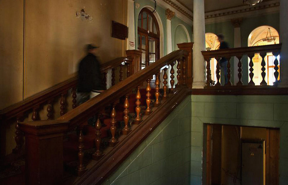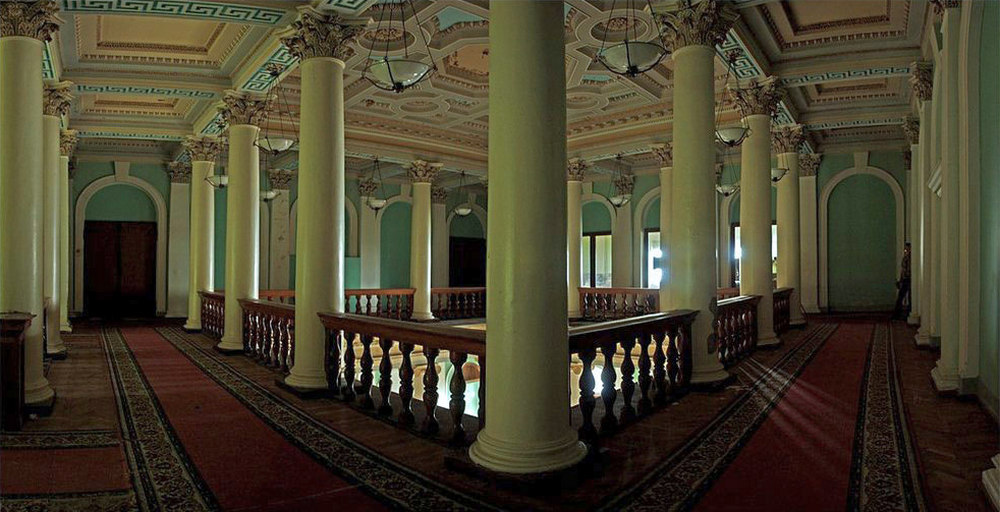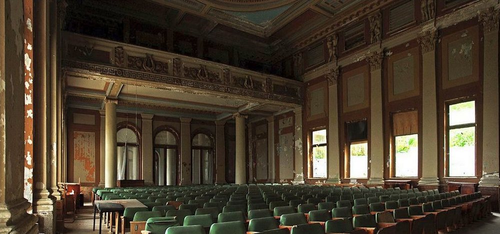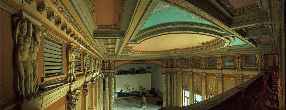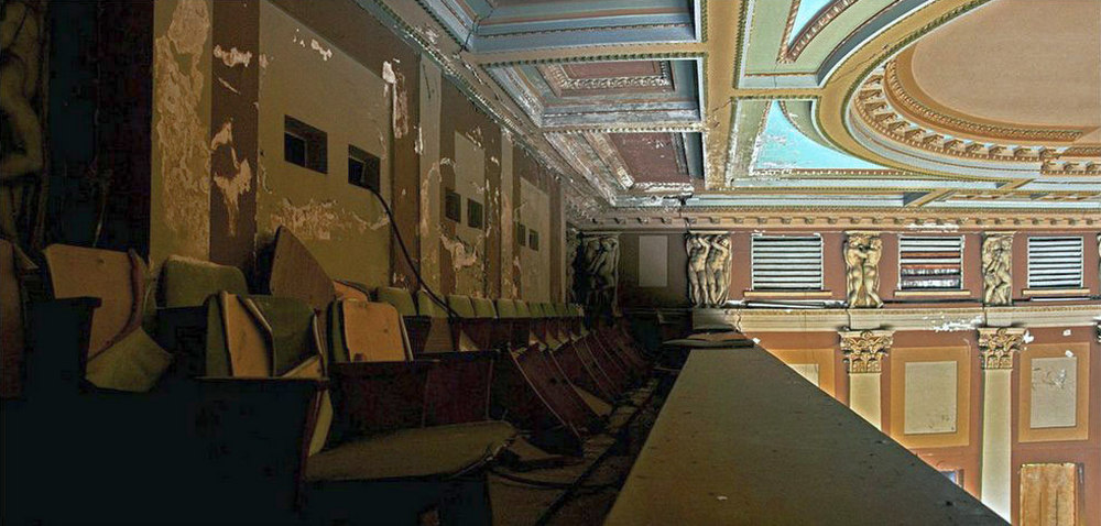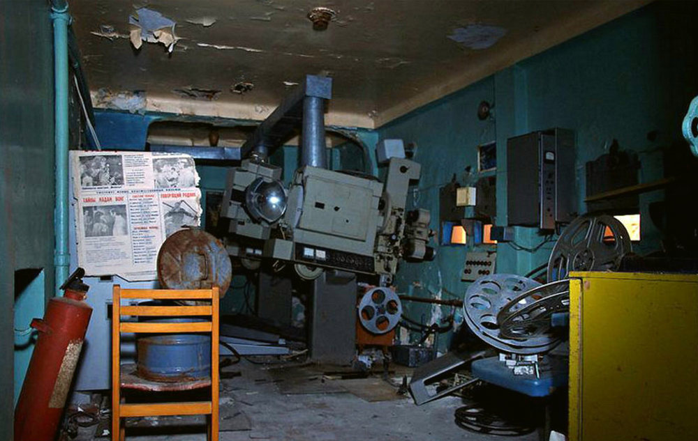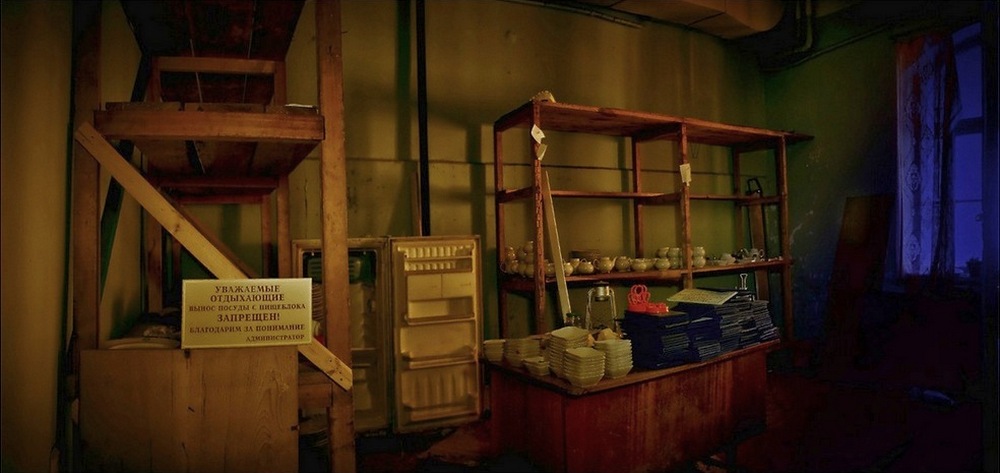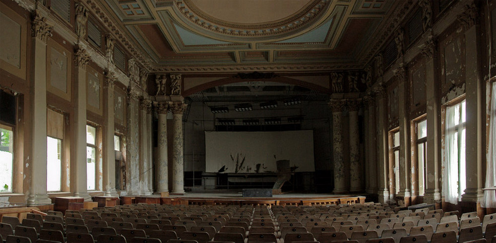 Панорамы на шикарный кинотеатр санатория Орджоникидзе, который находился на первом этаже напротив столовой и о коем можно писать цельные тома, потому как такую неписанную красоту встретишь не часто. На самом балконе, кстати, до того истлели полы, что я всей голенью провалился вниз, а в самой же аппаратной была така темень= хоть выколи глаз, отчего съемка велась на выдержке двух минут при постоянной подсветке двумя фонарями.