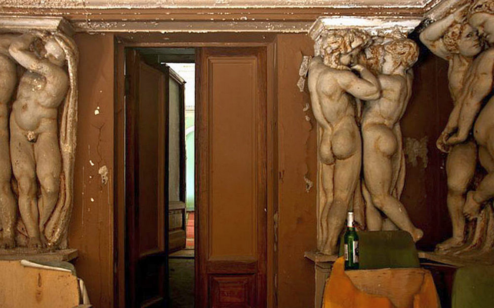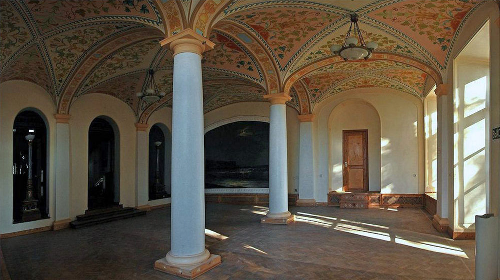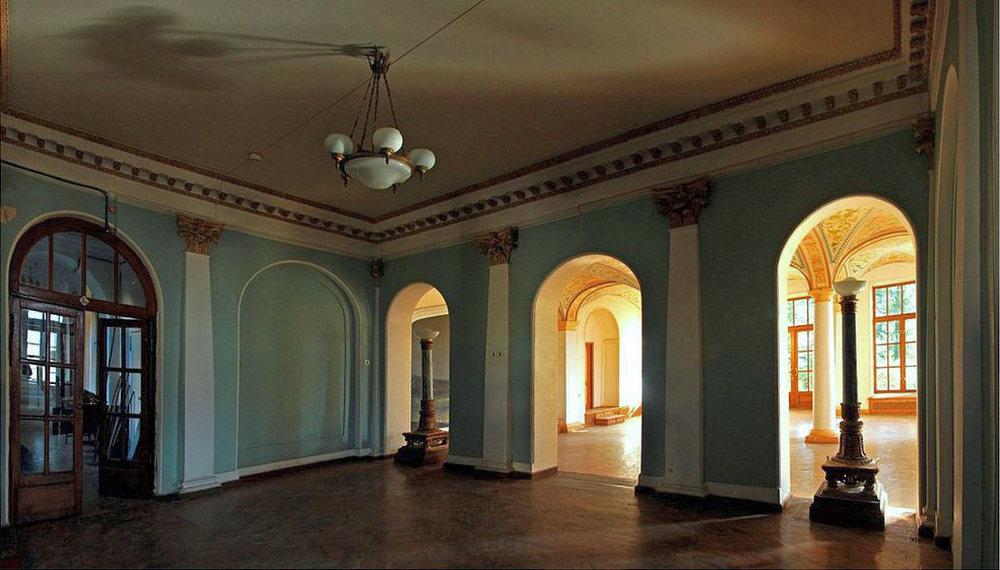 Далее посетим один из спальных корпусов, в частности фойе, потому как в самих номерах смотреть не на что = пустые они. Хочется отметить = еще в 70х годах прошлого века, когда в этом санатории работал мой отец, некоторые потолки с росписью мастерской Палех начали осыпаться и тогдашнее руководство приказало их просто покрыть маслянной краской дабы не реставрировать. Помню как отец с горечью об этом поведал ... а еще и переход между 2 и 3 корпусом просто взял да и рухнул и его не стали восстанавливать. Дело в том, что санаторий то был построен на оползневом участке и все годы свого существования в разных местах трещал по швам.