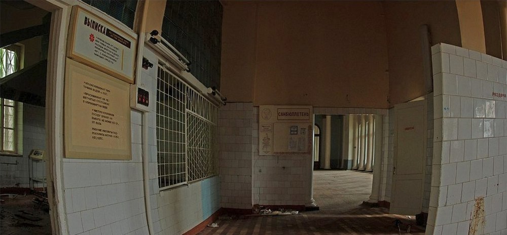 В продолжение темы заглянем в главный корпус = там есть на что посмотреть, так сказать - на останки былого величия ушедшей эпохи. Располагались в нем библиотека, кинозал типа клуба и столовая с пищеблоком в цокольном помещении.
